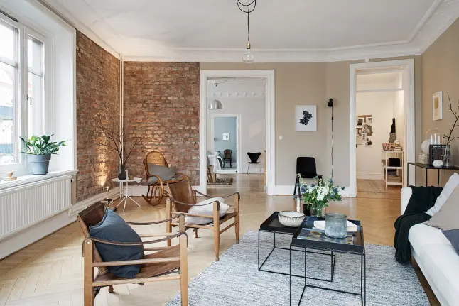 Desi camerele sunt nedecomandate, intrarea facandu-se dintr-o camera intr-alta, coerenta spatiului se pastreaza la un nivel subtil gratie compozitiei decorative. Pentru living, peretii din caramida descoperita (din structura originala a locuintei) confera un aer cald si usor vintage.