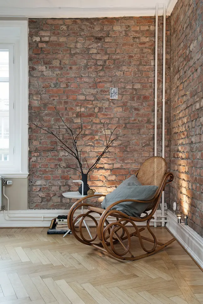 De fapt, partile cu caramida ale peretilor compun un superb colt de lectura si relaxare: scaunul tip leagan, luminile difuze care accentueaza discret structura peretilor, precum si decoratiunile alese.