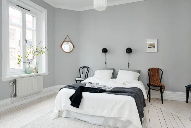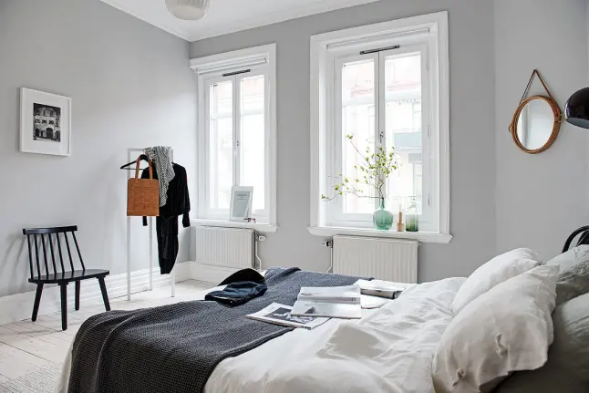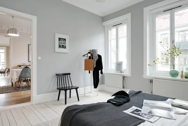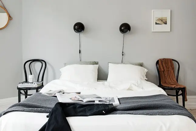Trecerea este lina catre dormitorul unde predomina acelasi ton relaxat, luminos. Cu pereti de un gri pal, pardoseala alba si accente de negru, decorul ne inspira acelasi aer minimalist. Scaunele folosite pe post de noptiere sunt o idee inedita pe care am mai intalnit-o si in alte amenajari cu specific scandinav.