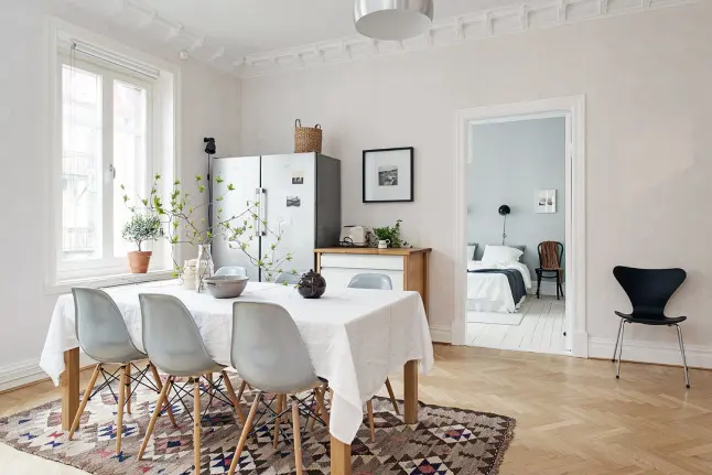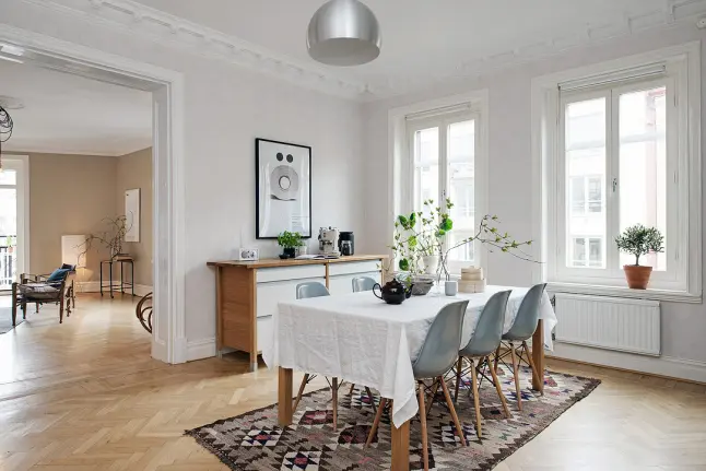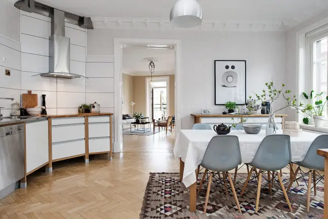 Bucataria este si ea o camera generoasa, incluzand si zona de dining. Avem aici o incapere mai luminoasa decat livingul cu pereti albi si o atmosfera usor atipica pentru o bucatarie, aratand mai mult ca o camera de zi. Lemnul parchetului si al mobilierului vin ca o completare armonioasa. Covorul cu motiv traditional pune in evidenta spatiul mesei.