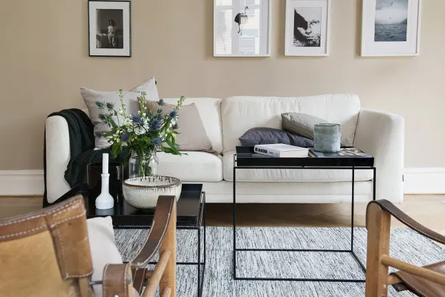 Gama cromatica pastreaza o atingere calda si placuta prin neutrele folosite pentru restul peretilor. Amenajarea este minimala, accentul punandu-se pe spatialitatea incaperii. Zona de conversatie are ca piesa centrala canapeaua alba si doua scaune din piele vintage. Accentele negre ale celor doua masute atragand atentia asupra punctului de interes din respectivul colt.