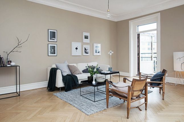 Gama cromatica pastreaza o atingere calda si placuta prin neutrele folosite pentru restul peretilor. Amenajarea este minimala, accentul punandu-se pe spatialitatea incaperii. Zona de conversatie are ca piesa centrala canapeaua alba si doua scaune din piele vintage. Accentele negre ale celor doua masute atragand atentia asupra punctului de interes din respectivul colt.
