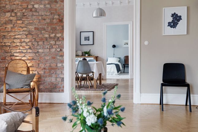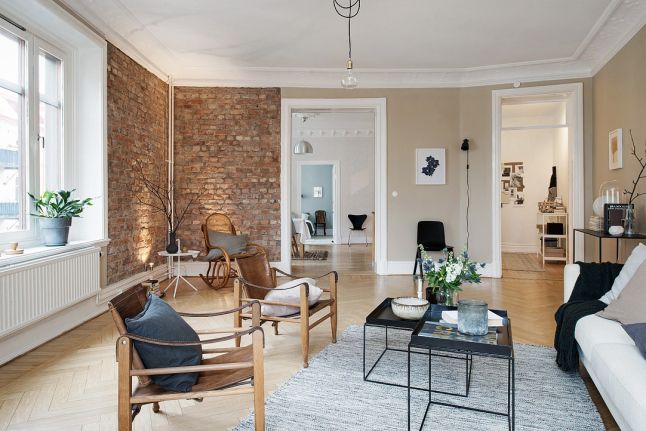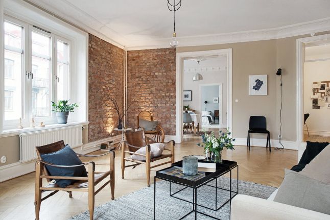 Desi camerele sunt nedecomandate, intrarea facandu-se dintr-o camera intr-alta, coerenta spatiului se pastreaza la un nivel subtil gratie compozitiei decorative. Pentru living, peretii din caramida descoperita (din structura originala a locuintei) confera un aer cald si usor vintage.