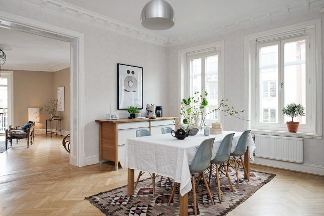 Bucataria este si ea o camera generoasa, incluzand si zona de dining. Avem aici o incapere mai luminoasa decat livingul cu pereti albi si o atmosfera usor atipica pentru o bucatarie, aratand mai mult ca o camera de zi. Lemnul parchetului si al mobilierului vin ca o completare armonioasa. Covorul cu motiv traditional pune in evidenta spatiul mesei.