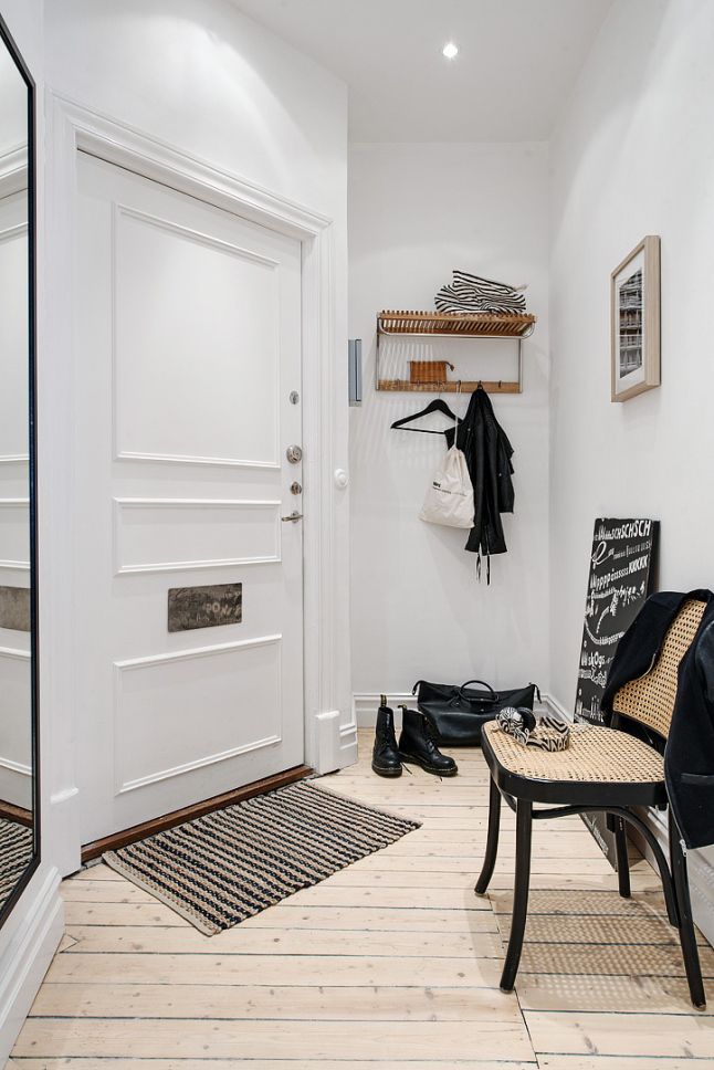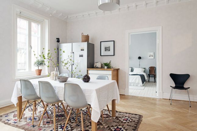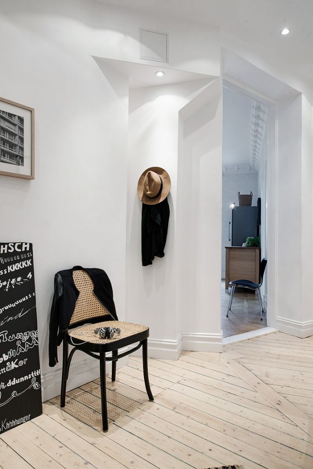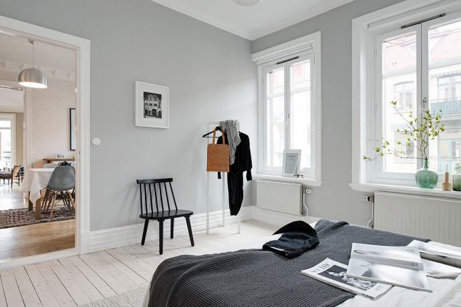 Trecerea este lina catre dormitorul unde predomina acelasi ton relaxat, luminos. Cu pereti de un gri pal, pardoseala alba si accente de negru, decorul ne inspira acelasi aer minimalist. Scaunele folosite pe post de noptiere sunt o idee inedita pe care am mai intalnit-o si in alte amenajari cu specific scandinav.