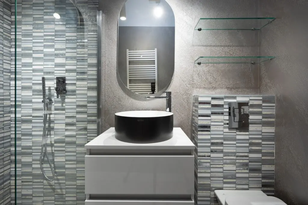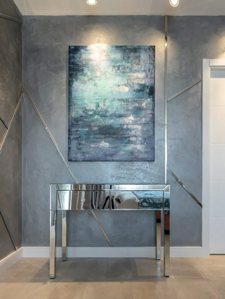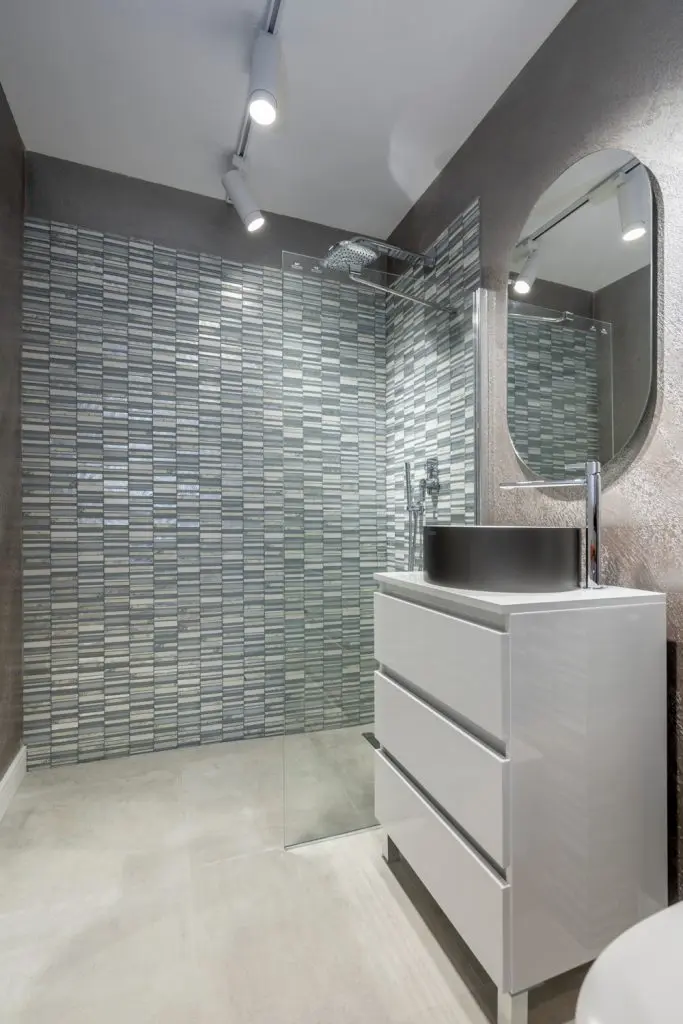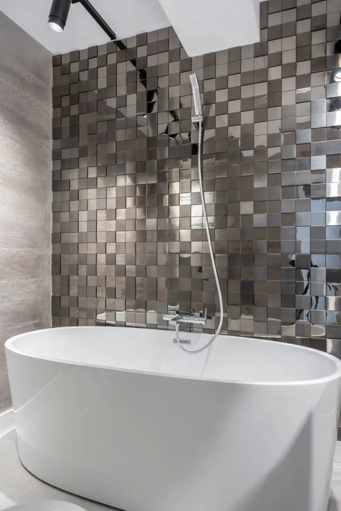 Cele doua bai cu aspect futurist aduc in prim plan mozaicul metalic si accesoriile cromate.La mobilierul minimalist se adauga componente sanitare moderne care, impreuna cu sticla, oglinzile si spoturile cu aspect de reflectoare, fac ca intreaga amenajare sa respecte din plin ultimele tendinte.