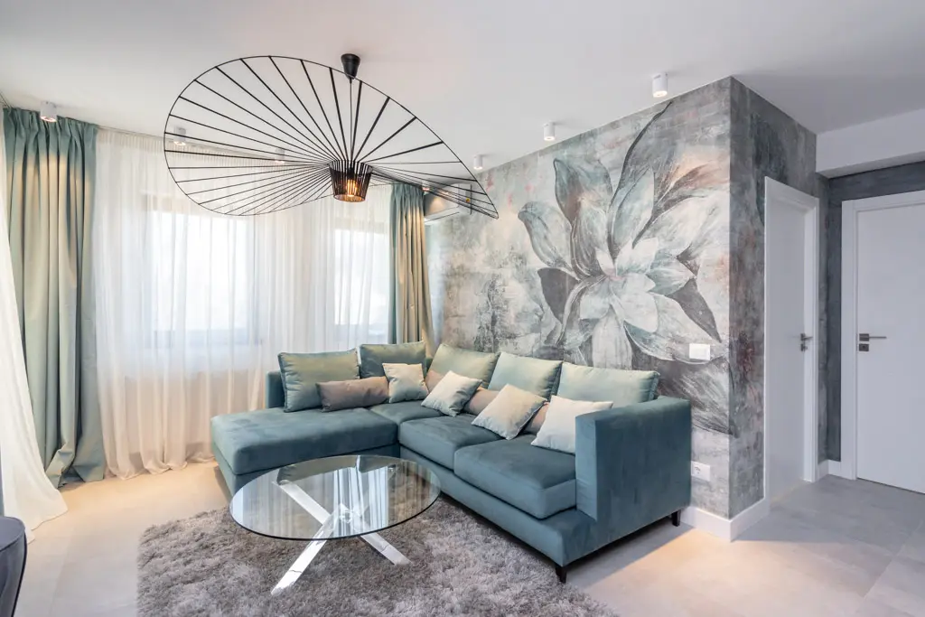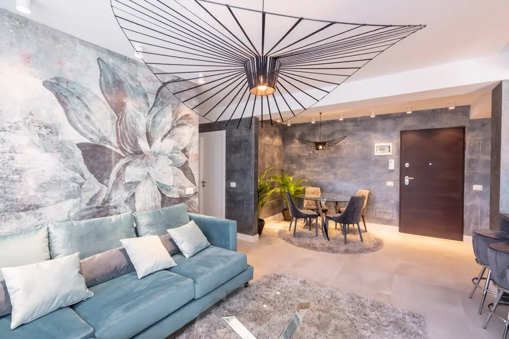Living-ul se identifica printr-un coltar de mari dimensiuni ce reuseste sa capteze atentia impreuna detaliile inflorate ale tapetului. Cele trei componente care scot intregul open space din anonimat sunt fara indoiala sticla, oglinzile si corpurile de iluminat artificial care, in cazul living-ului si a zonei de dining, se prezinta cu un design ultra modern.
