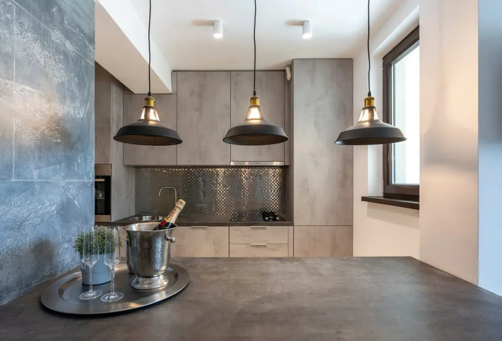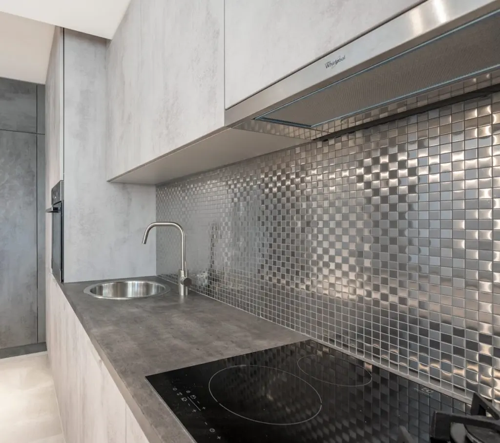 Mobilierul bucatariei este unul minimalist, aproape confundabil cu design-ul mural, identificandu-se foarte usor cu acesta. Separarea corpurilor superioare de cele inferioare se face intr-un mod modern si abstract, prin adaugarea murala a mozaicului metalic.