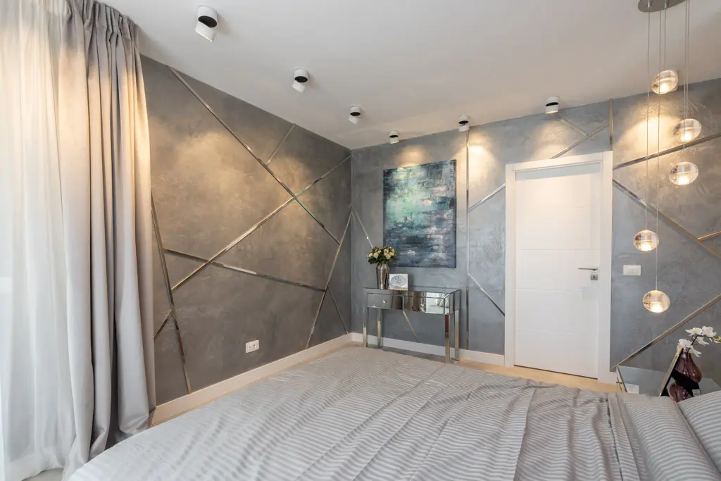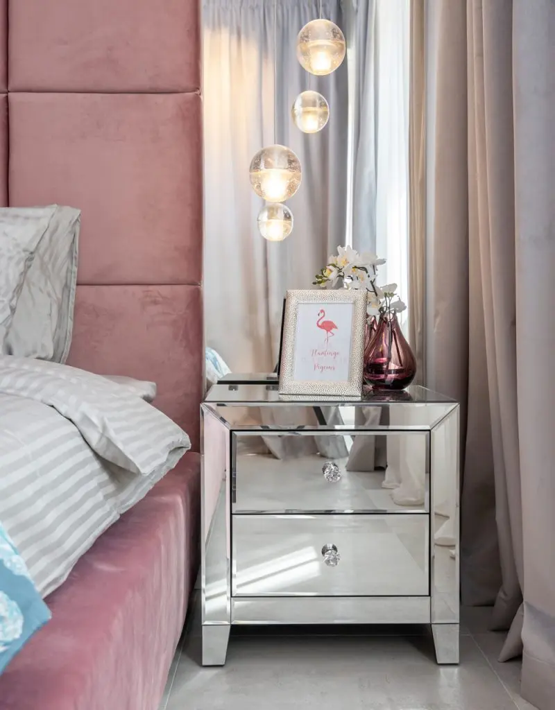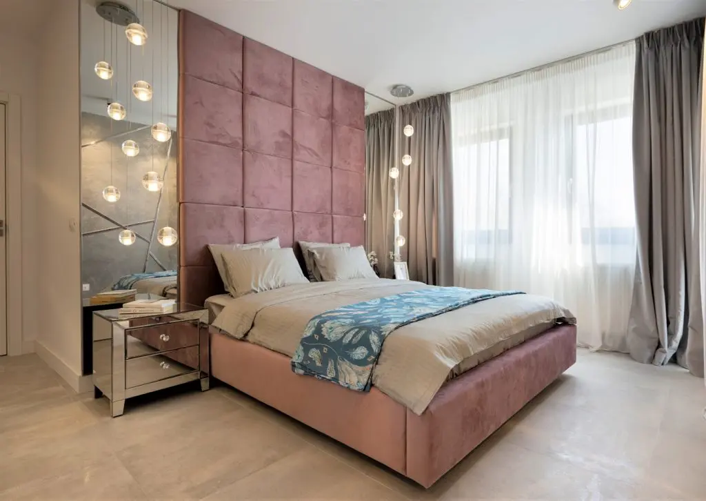 Cu un stil de exceptie la care se adauga un plus de feminitate, dormitorul matrimonial capata un rol functional care capteaza inevitabil atentia datorita unei estetici moderne si “de revista”. Si aici regasim aceleasi texturi de catifea, insertii metalice si oglinzi supradimensionate. Accentele delicate sunt date de introducerea rozului ca si nuanta principala dar si de corpurile de iluminat cu aspect pretios, precum pendulurile cu globuri din sticla. In ceea ce priveste detaliile inedite, enumeram aici tablia din catifea care se intinde pe toata inaltimea peretelui, sinele metalice asezate mural si cele doua noptiere alcatuite complet din oglinzi.