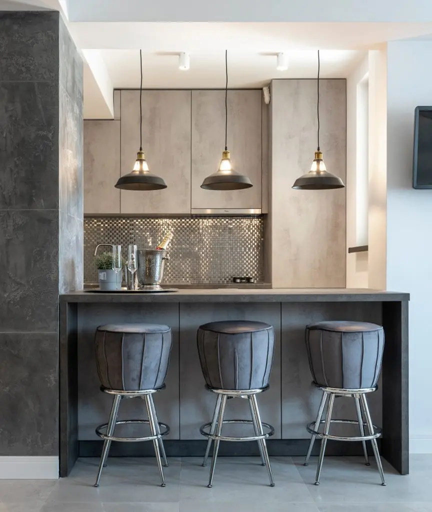 Spatiul bucatariei se continua prin adaugarea unei insule cu 3 scaune de bar, tapitate. Zona de dining si spatiul dedicat relaxarii par ca se afla in oglinda, mobilierul si componentele de iluminat pastrand aceleas detalii, in alte dimensiuni.