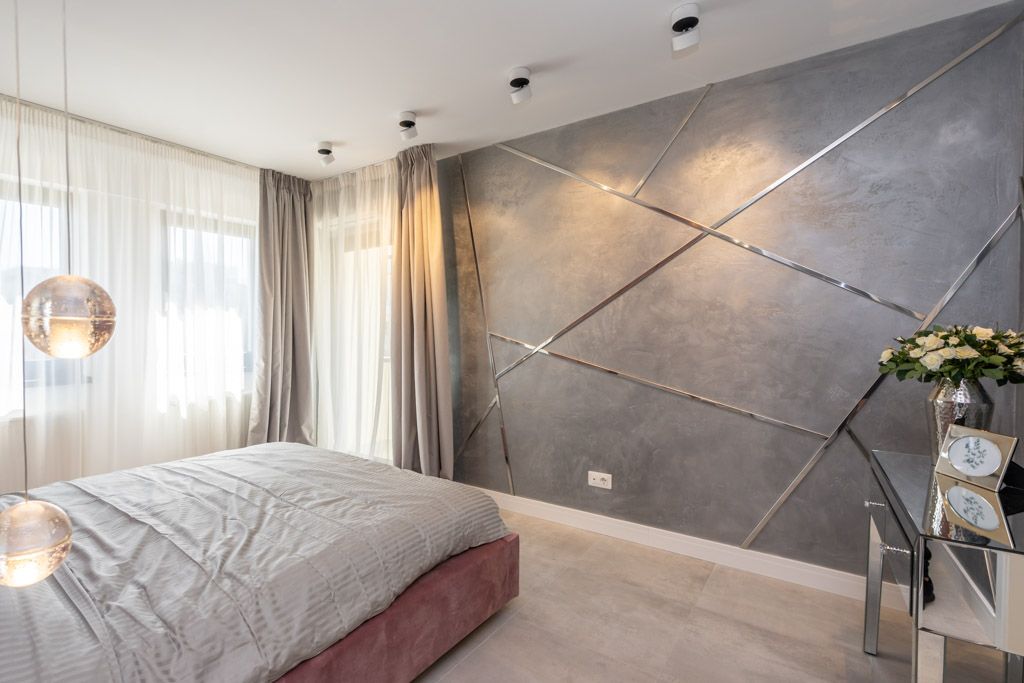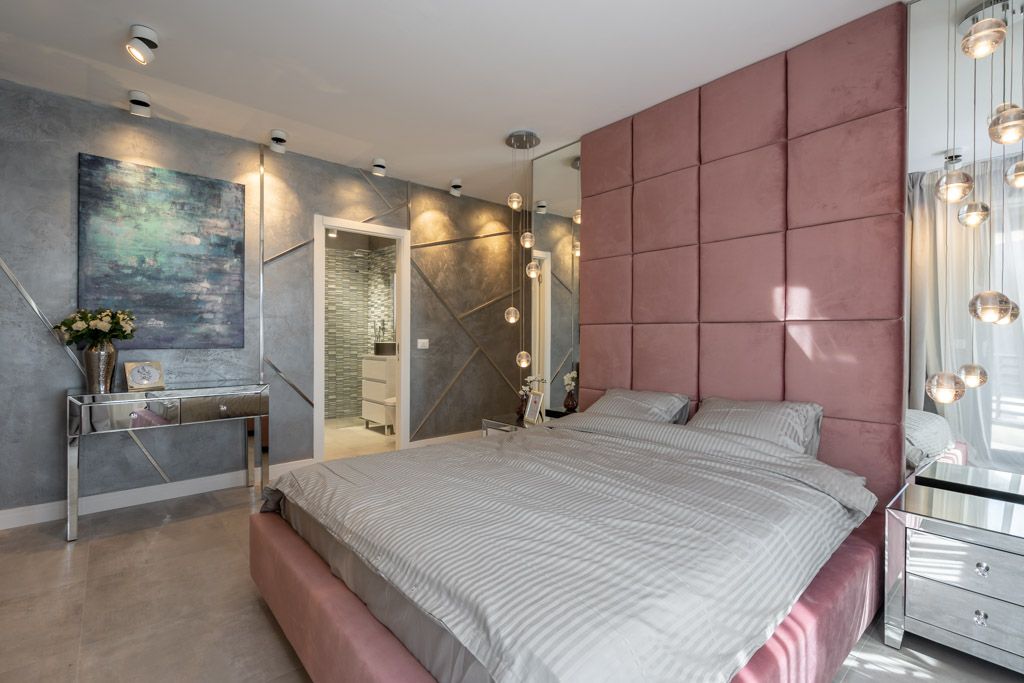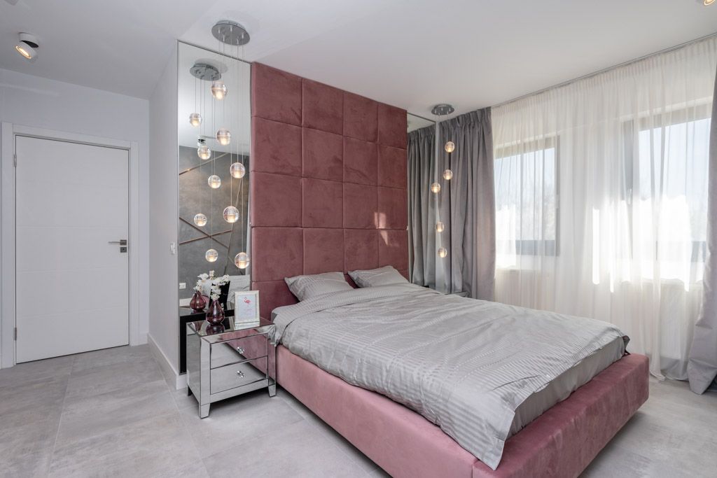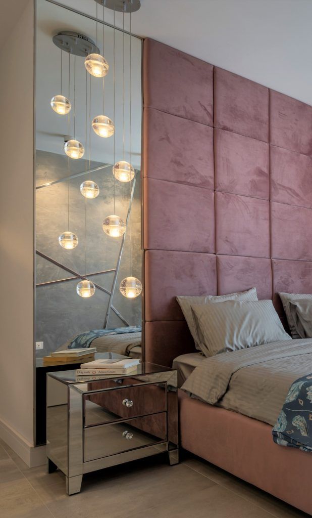 Cu un stil de exceptie la care se adauga un plus de feminitate, dormitorul matrimonial capata un rol functional care capteaza inevitabil atentia datorita unei estetici moderne si “de revista”. Si aici regasim aceleasi texturi de catifea, insertii metalice si oglinzi supradimensionate. Accentele delicate sunt date de introducerea rozului ca si nuanta principala dar si de corpurile de iluminat cu aspect pretios, precum pendulurile cu globuri din sticla. In ceea ce priveste detaliile inedite, enumeram aici tablia din catifea care se intinde pe toata inaltimea peretelui, sinele metalice asezate mural si cele doua noptiere alcatuite complet din oglinzi.