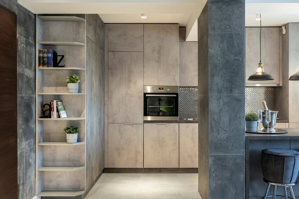 Mobilierul bucatariei este unul minimalist, aproape confundabil cu design-ul mural, identificandu-se foarte usor cu acesta. Separarea corpurilor superioare de cele inferioare se face intr-un mod modern si abstract, prin adaugarea murala a mozaicului metalic.
