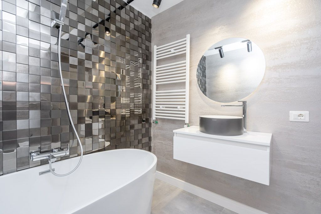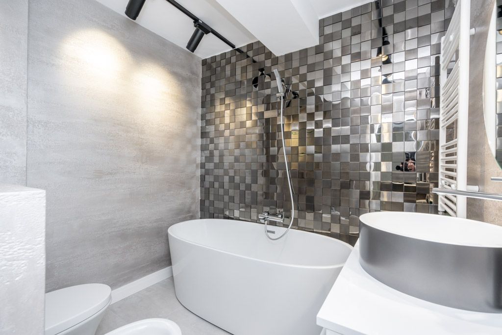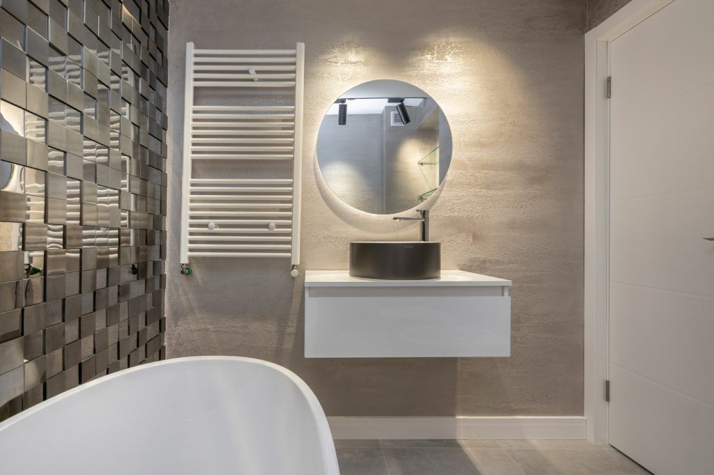Cele doua bai cu aspect futurist aduc in prim plan mozaicul metalic si accesoriile cromate.La mobilierul minimalist se adauga componente sanitare moderne care, impreuna cu sticla, oglinzile si spoturile cu aspect de reflectoare, fac ca intreaga amenajare sa respecte din plin ultimele tendinte.