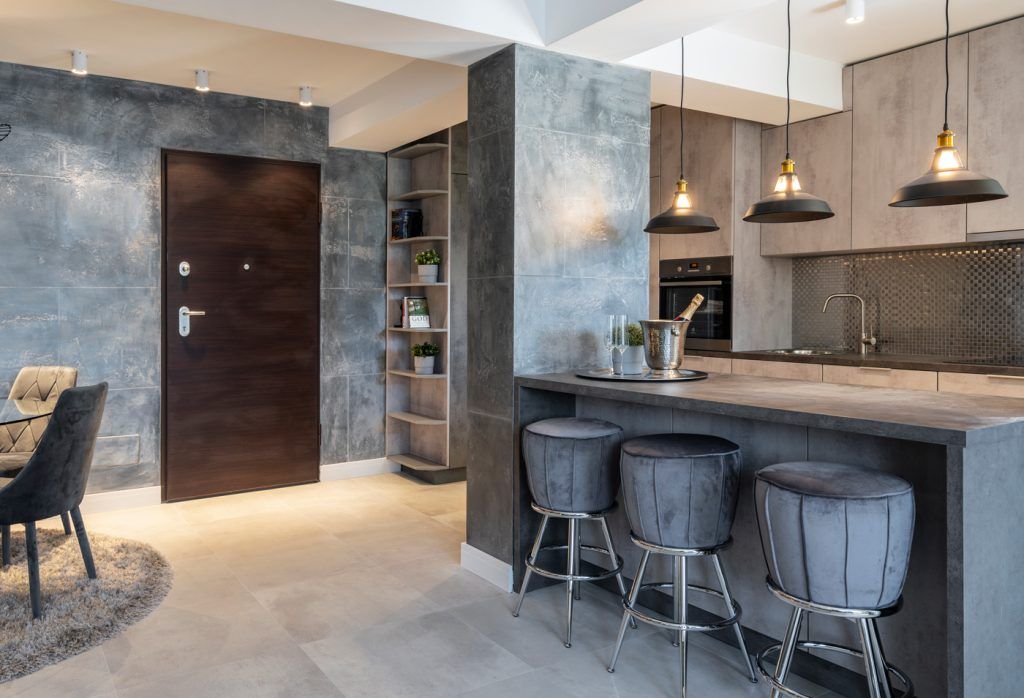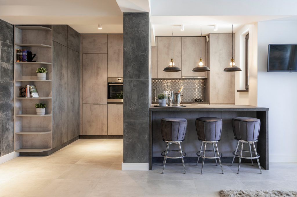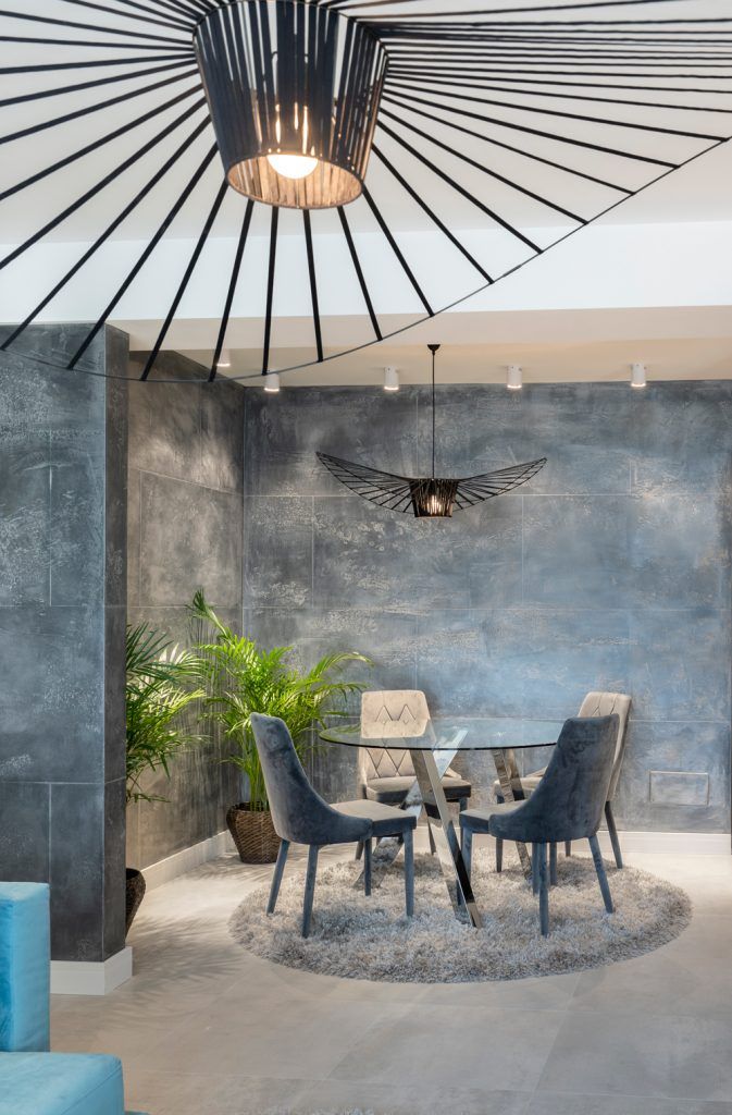 Spatiul bucatariei se continua prin adaugarea unei insule cu 3 scaune de bar, tapitate. Zona de dining si spatiul dedicat relaxarii par ca se afla in oglinda, mobilierul si componentele de iluminat pastrand aceleas detalii, in alte dimensiuni.