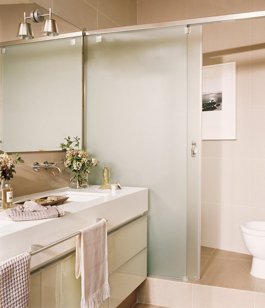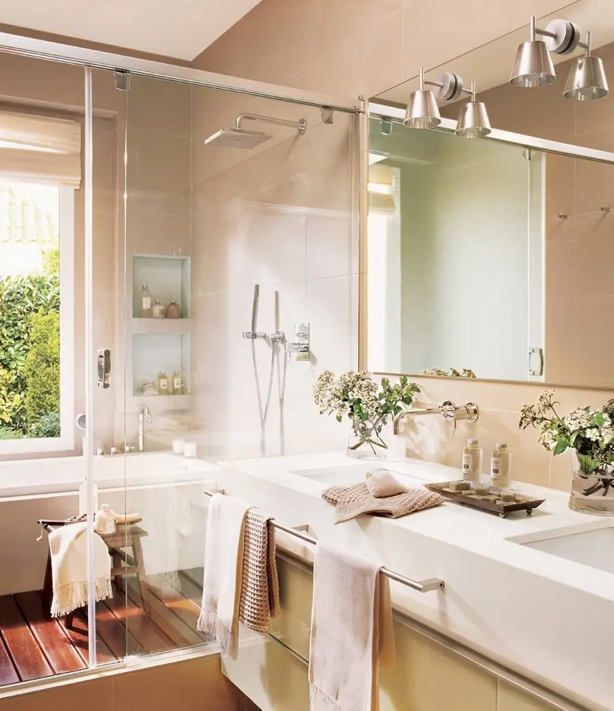 Sa ai o experienta de spa chiar la tine in baie? Iata cum poate fi posibila intr-o amenajare. Spatiul dedicat imbaierii este despartit de un panou similar precum cel mentionat mai sus, diferenta fiind ca aici pe langa zona de dus avem si o cada. Lavoar suspendat, doua chiuvete, o oglinda supradimensionata si am obtinut o amenajare pur si simplu superba.