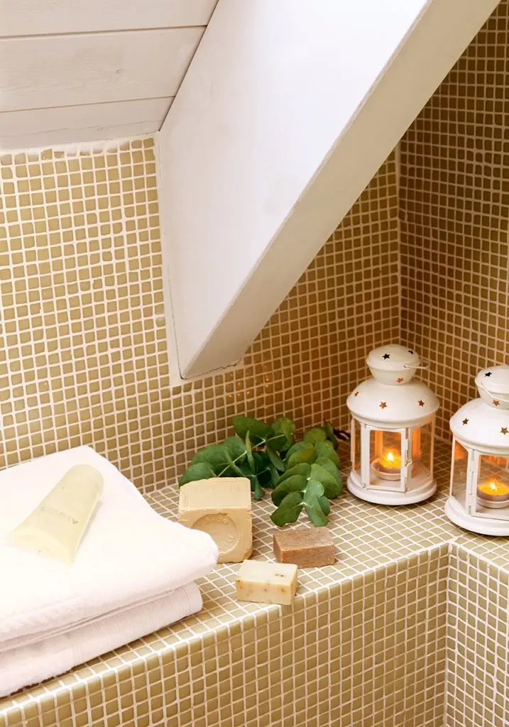Farmecul aparte al acestui decor il constituie grinzile expuse vopsite in alb, baia fiind situata la etaj; decoratiunile seteaza atmosfera perfecta pentru relaxare.