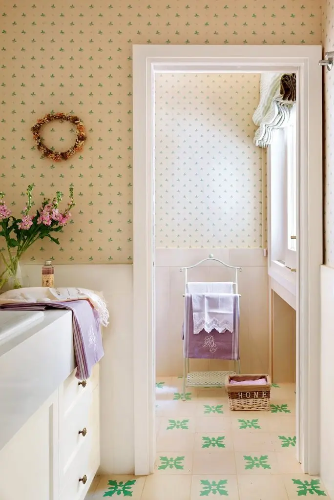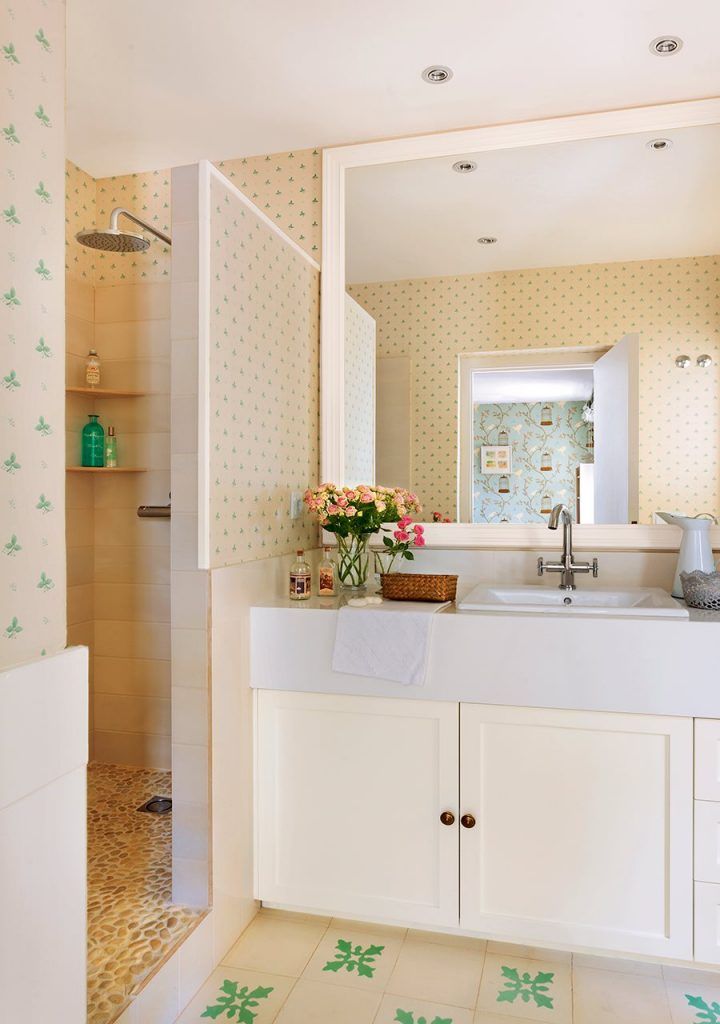 Evita sa montezi tapet pe zonele de stropire. Alege mai degraba placi ceramice pentru a proteja peretele de apa. Iata o amenajare cu accente feminine si un spatiu coerent cu restul amenajarii.