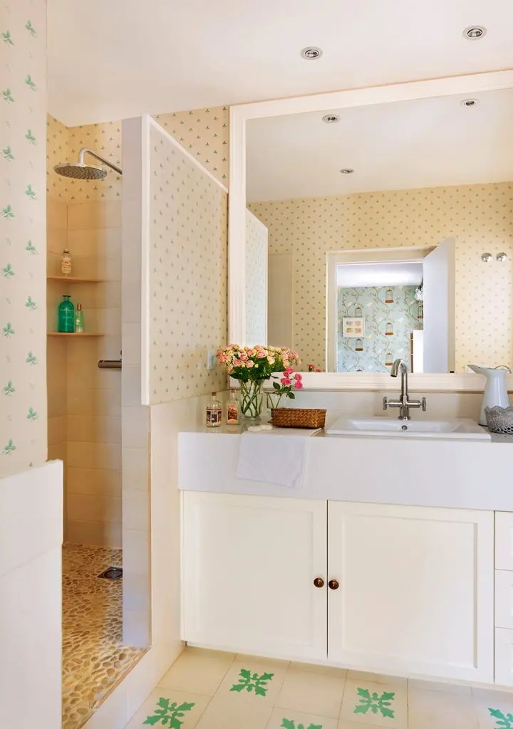 Daca iti doresti sa oferi personalitate baii tale, cel de-al patrulea model vine cu o idee frumoasa: un tapet cu un model foarte dragut. Evita sa montezi tapet pe zonele de stropire. Alege mai degraba placi ceramice pentru a proteja peretele de apa. Mi-a placut foarte mult si pardoseala mozaicata din zona dusului.