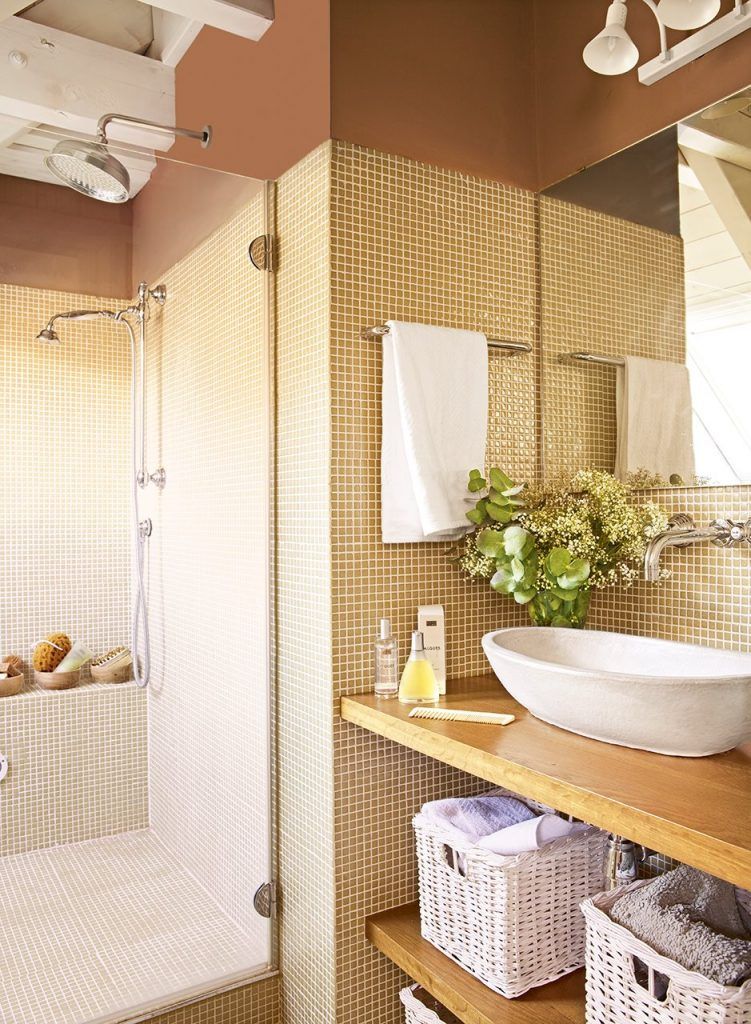 Si daca inca nu te-am convins ca se poarta mult lemnul in amenajarea de baie, cea de-a sasea propunere vine direct cu etajere din lemn tratat folosite pe post de lavoar. Cateva cosuri din ratan vopsite in alb ofera suport pentru prosoape si alte accesorii de baie. Farmecul aparte al acestui decor il constituie grinzile expuse vopsite in alb, baia fiind situata la etaj.