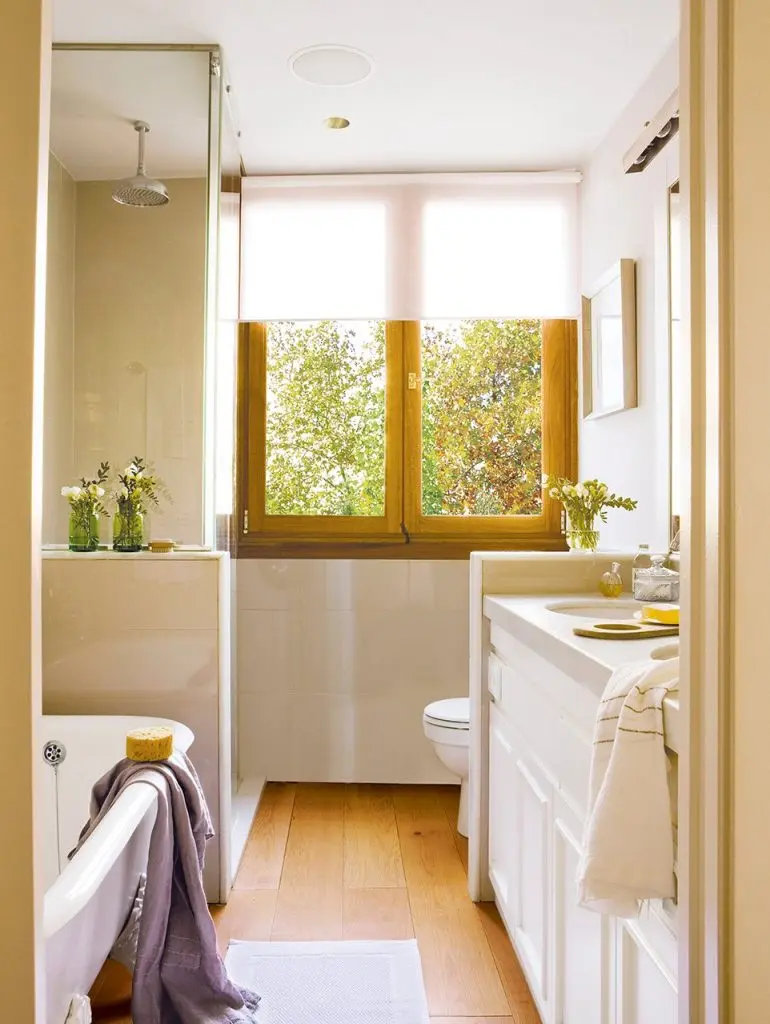 Dispunerea paralela a functiunilor (lavoarului si a cazii, a toaletei si a cabinei de dus) ajuta la o folosire eficienta a spatiului. Plus nelipsita fereastra. Textura lemnului imbogateste vizual spatiul, iar placile ceramice bej-lucios insotesc armonios finisajele. Aspectul clasic al cazii confera un aer rafinat.