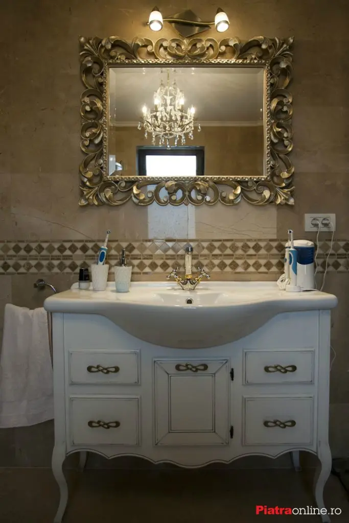 Pentru o alta baie, Andreea a mers pe cateva combinatii impresionante de elemente: “Initial am vrut sa pun un brau dar apoi m-am decis sa fac un intreg perete de mozaic, in spatele cazii, care a iesit foarte frumos.” Mai mult, Andreea a cautat mult timp, pana a gasit o firma romaneasca (Art Mobilier) de la care a luat mobilierul de lemn si ramele oglinzilor in exact stilul pe care il cauta, majoritatea pieselor avand linii curbe, finisaj antichizat, mici elemente sculptate in lemn si insertii de foita aurie, intr-un ambient inspirat din stilul venetian.