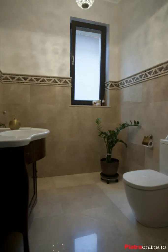 Pardoseala si peretele sunt placate cu marmura, borduraeste de tipul Rock 3, realizata din marmura maro Emperador si Burdur, la care a fost adaugata o bagheta M1 din marmura Light Beige.