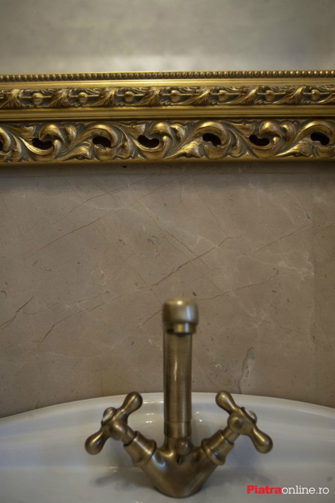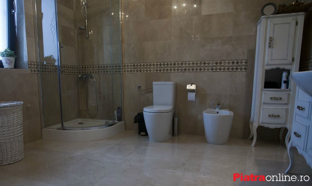 Pardoseala si peretele sunt placate cu marmura, borduraeste de tipul Rock 3, realizata din marmura maro Emperador si Burdur, la care a fost adaugata o bagheta M1 din marmura Light Beige.