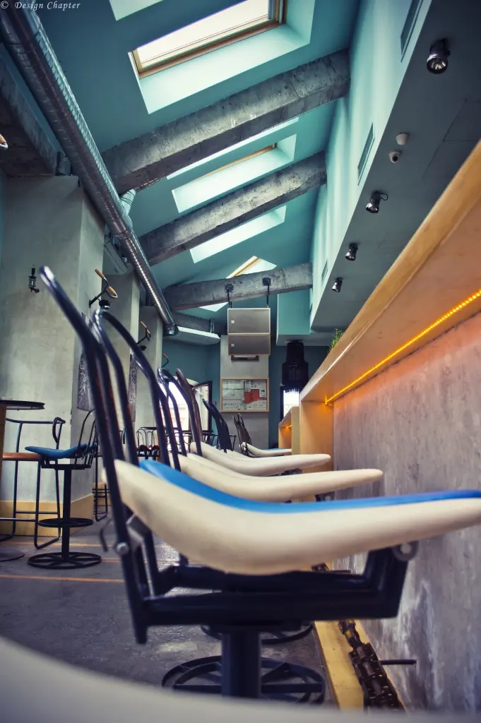 Barul este si el foarte lung, potrivit spatiului. Extremitatile acestuia sunt realizate din piele lucrata de Boohooho Leather Design, fiind inspirat din centurile cu scule folosite la depanari. Super ingenios mi s-a parut si suportul pentru picioare de la bar facut din zeci de ghidoane.