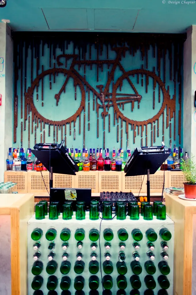 Decoratiunea din spatele barului, bicicleta care se prelinge este tot ideea lui Stefan si a fost realizata din 3000 de piulite! In Bicicleta exista de asemenea si o zona de lounge de unde se poate admira candelabrul facut tot din faruri de bicicleta.