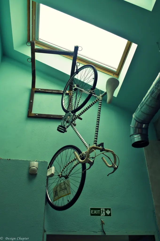 Predominastilul industrial, pe jos este turnat beton elicopterizat iar peretii si grinzile sunt finisate cu beton aparent . Pentru a mai” indulci” putin acest aspect destul de dur al betonului, tavanul de mansarda a fost vopsit in albastru deschis. Dar nu asta e ceea ce diferentiaza Bicicleta de alteconcept-baruri din Bucuresti, doar sunt atatea cu tema industriala.