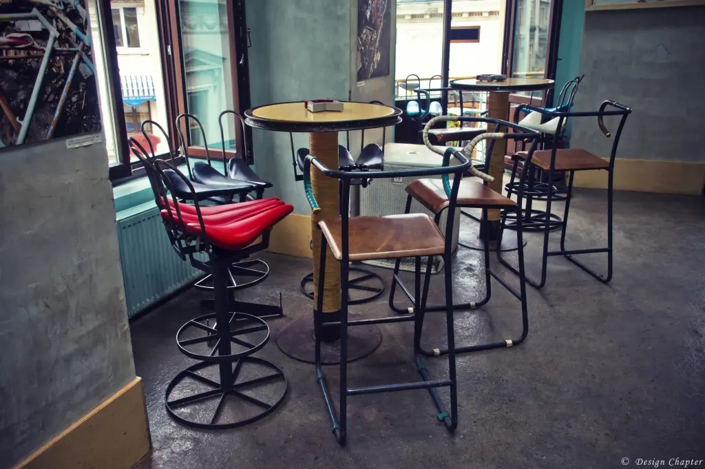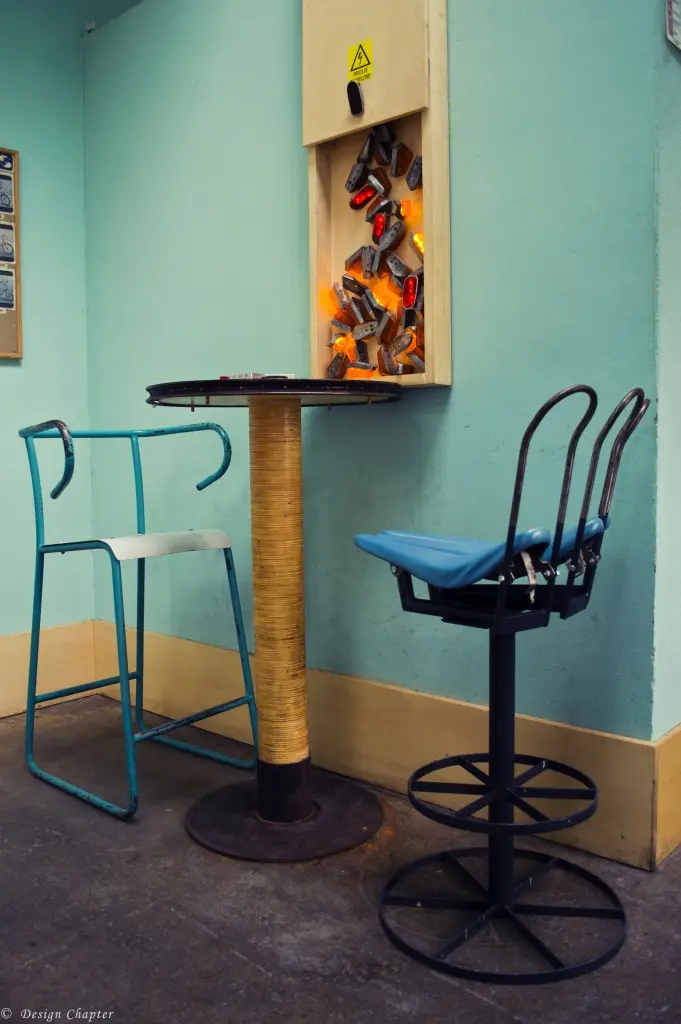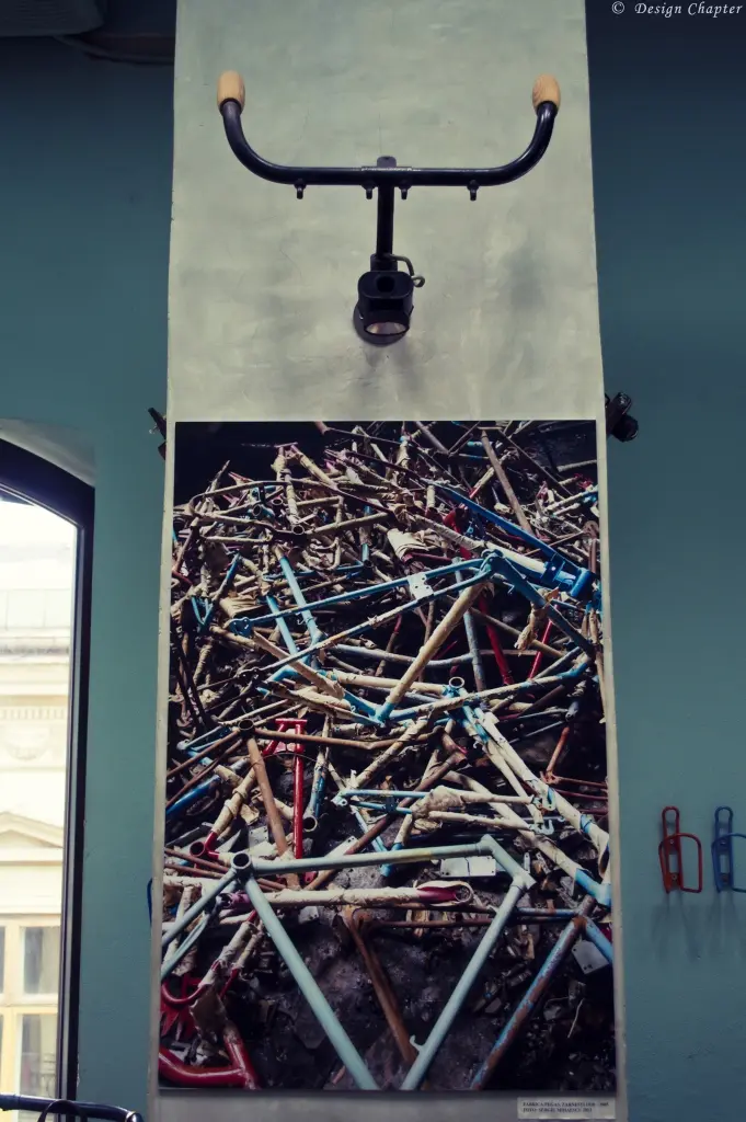 Ce mi-a placut cel mai mult la mobilierul lor este ca pe masura ce ma uitam mai atent mai descopeream vreo bucatica de bicicleta asamblata ingenios pe undeva. Scaunele sunt alcatuite din doua sei iar picioarele inca poarta emblema fabricii.