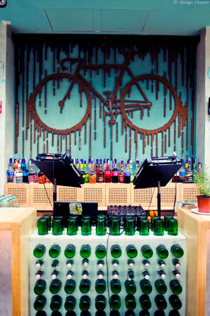 Barul este si el foarte lung, potrivit spatiului. Extremitatile acestuia sunt realizate din piele lucrata de Boohooho Leather Design, fiind inspirat din centurile cu scule folosite la depanari. Super ingenios mi s-a parut si suportul pentru picioare de la bar facut din zeci de ghidoane. Decoratiunea din spatele barului, bicicleta care se prelinge este tot ideea lui Stefan si a fost realizata din 3000 de piulite! In Bicicleta exista de asemenea si o zona de lounge de unde se poate admira candelabrul facut tot din faruri de bicicleta.
