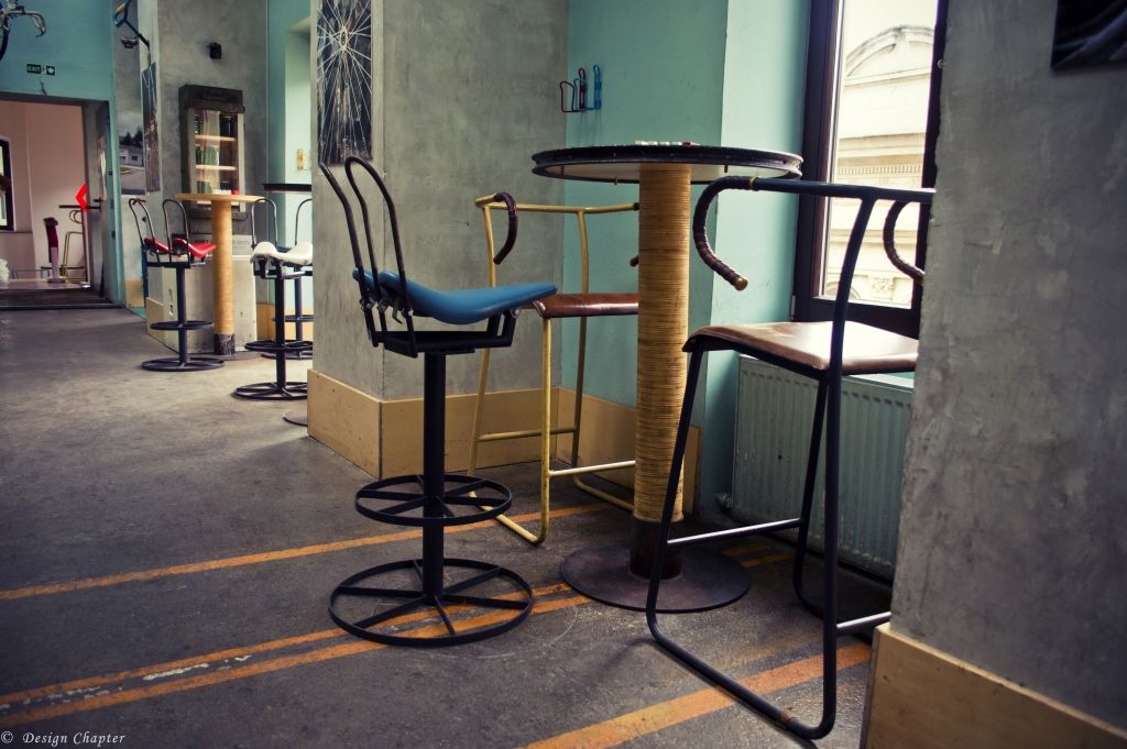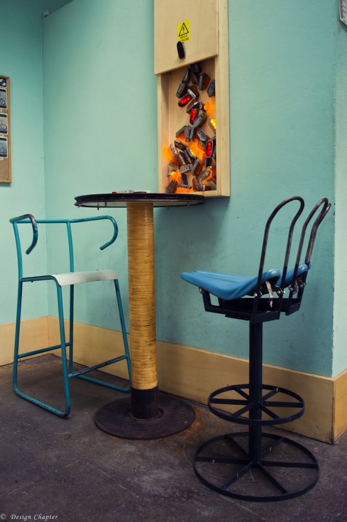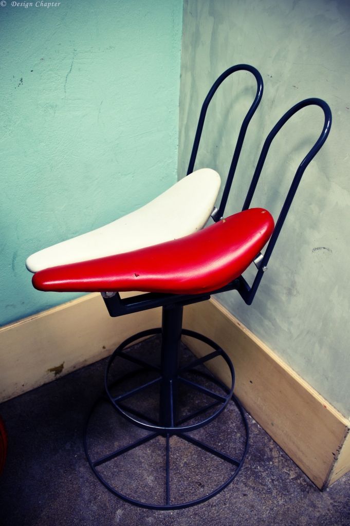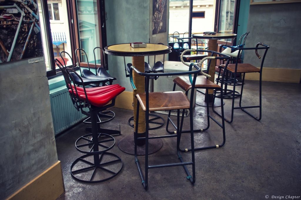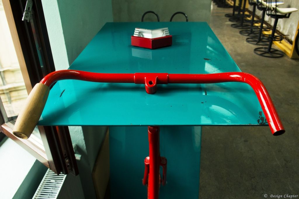 Ce mi-a placut cel mai mult la mobilierul lor este ca pe masura ce ma uitam mai atent mai descopeream vreo bucatica de bicicleta asamblata ingenios pe undeva. Scaunele sunt alcatuite din doua sei iar picioarele inca poarta emblema fabricii. Al doilea model de scaun are spatarul in forma de ghidon, mesele rotunde au drept cadru o roata, iar de pe stalpii de beton se apleaca ghidoane cu faruri de bicicleta montate in centru.