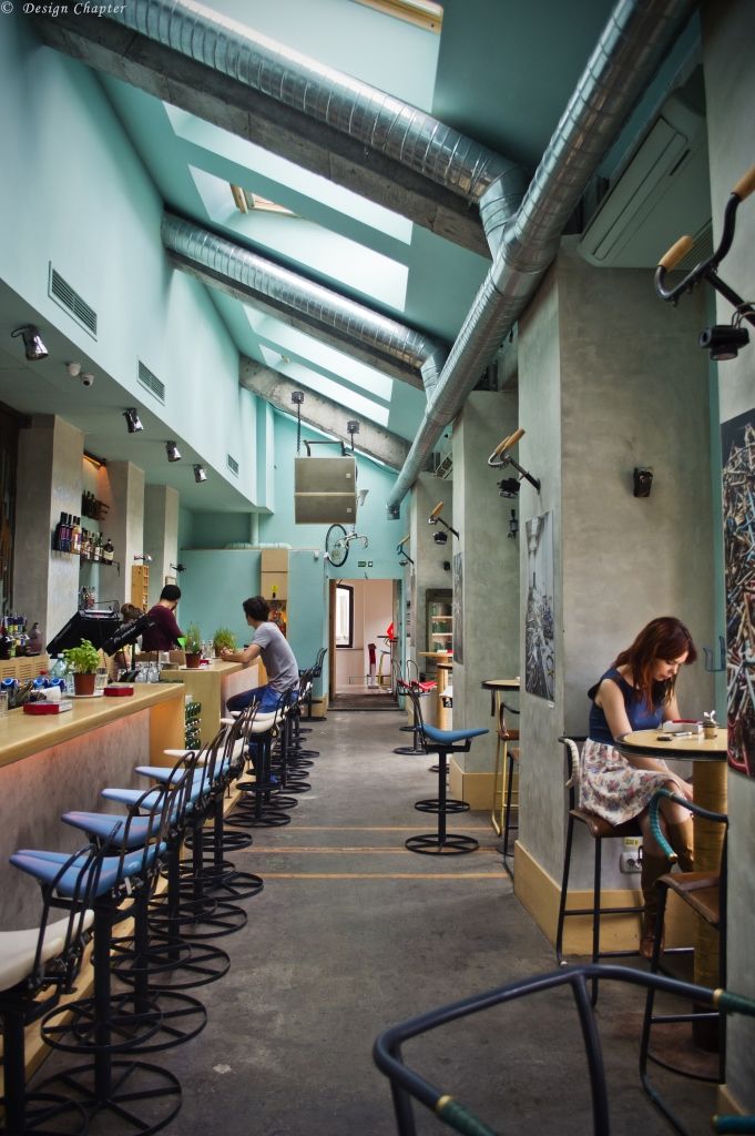 Spatiul este mai exact o mansarda mai inalta ce are atat ferestre tipice unei mansarde cat si ferestre obisnuite ceea ce face ca localul sa fie extrem de luminos, un mare plus din punctul meu de vedere. Sincer va spun ca nu stii la ce sa te uiti mai intai cand intri. Prima impresie este aceea ca spatiul are un puternic efect longitudinal ce te invita sa il parcurgi si sa il descoperi.