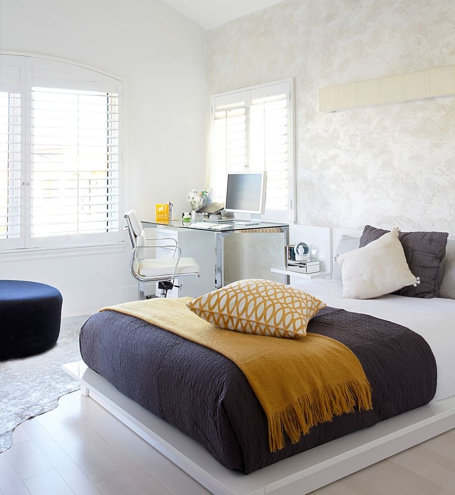 Puteti delimita vizual patul de partea de birou printr-un panou sau printr-o simpla draperie (functioneaza excelent in cazul paturilor cu baldachin).