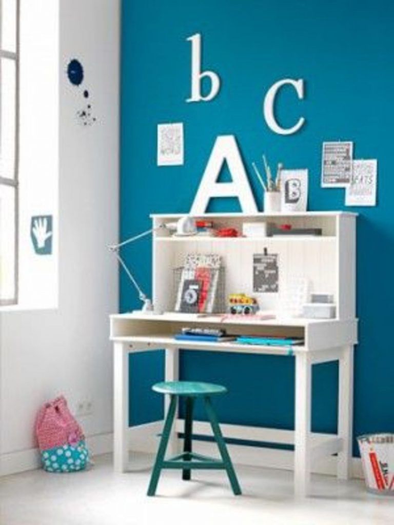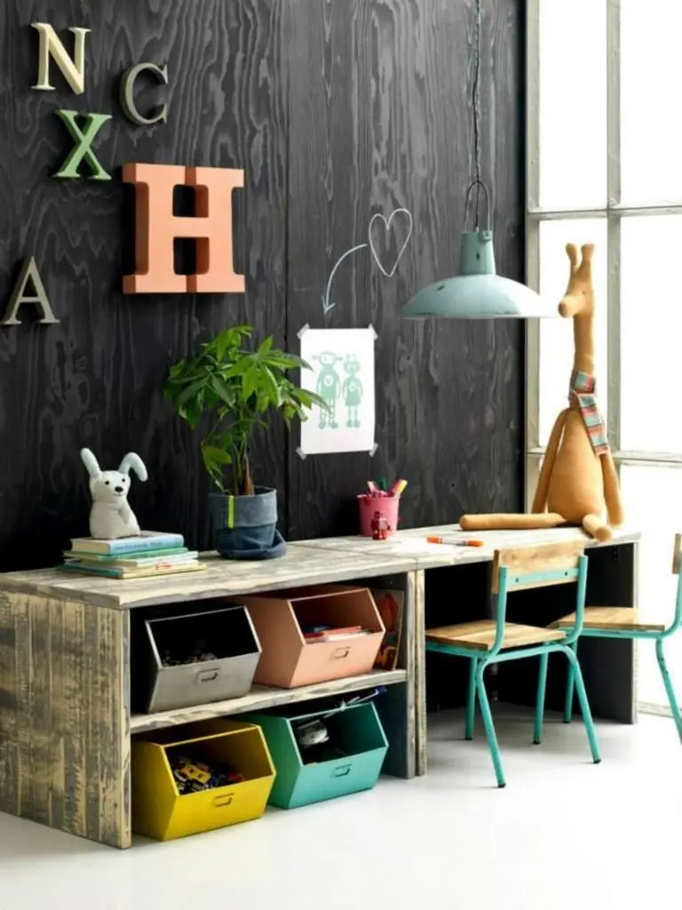 Exemplul 1 – In aceasta camera lemnul este omniprezent! Scaunele, zidul, si, desigur, biroul, toate din lemn, reprezinta un amestec reusit. Fara a fi simplist, biroul reuseste sa fie atat practic cat si aspectuos. Scaunele colorate pastel, cutiile de depozitare si literele atasate de perete ofera spatiului un caracter puternic.