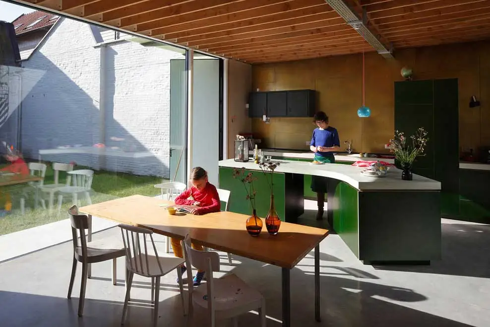 Bucataria este o combinatie de placaj verde, alama si beton tot verzi si se deschide catre curtea din spate, lasand lumina naturala sa inunde spatiul de locuit.