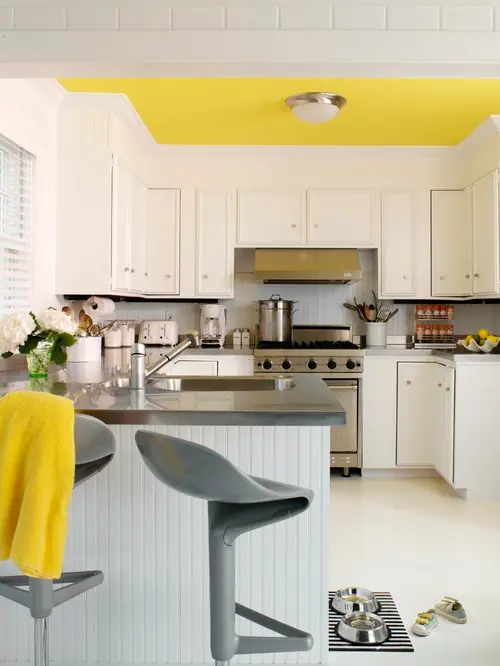 O idee curajoasa si de mare efect zugravirea tavanului cu galben; cu adevarata o pata de culoare pentru o bucatarie complet alba
