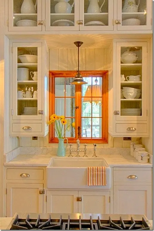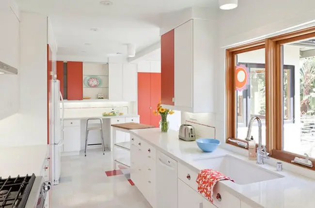 Tocul ferestrei vopsit in oranj un element care atrage toate privirile in aceasta bucatarie alba.