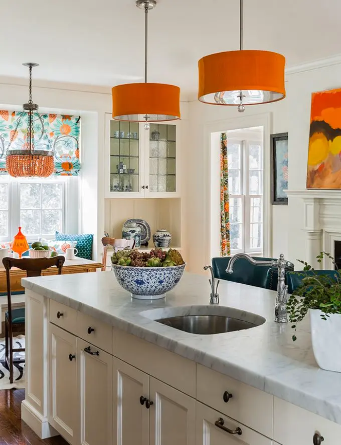 Accente de oranj intr-o bucatarie preponderent alba