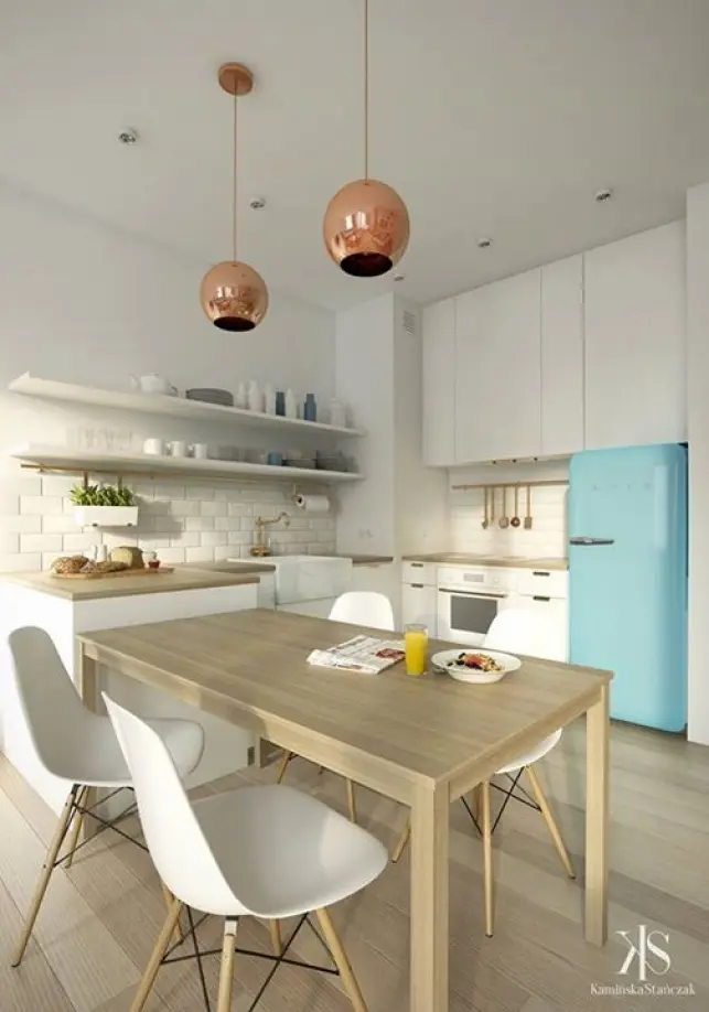 Corpuri de iluminat colorate asortate cu mici insertii de turcoaz o combinatie varatica foarte placuta privirii si mai ales potrivita unei bucatarii cu fundal alb.