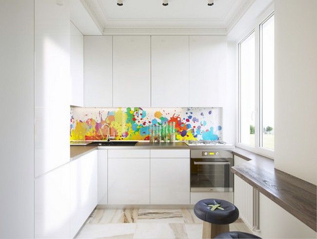 Frontul dintre corpurile de mobilier accentuat printr-un model abstract cu multiple culori. Remarcati cat de diferit se simte atmosfera pe fundalul complet alb al bucatariei