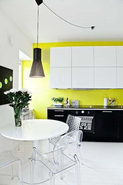 Un accent de galben-lime intr-o amenajare minimalista cu fundal alb si suprafete netede si lucioase.