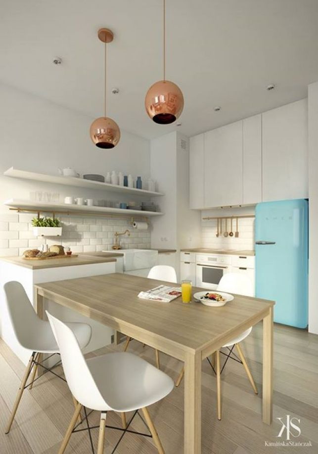 Corpuri de iluminat colorate asortate cu mici insertii de turcoaz o combinatie varatica foarte placuta privirii si mai ales potrivita unei bucatarii cu fundal alb.
