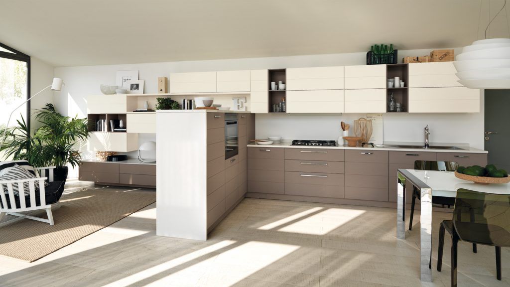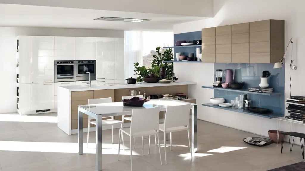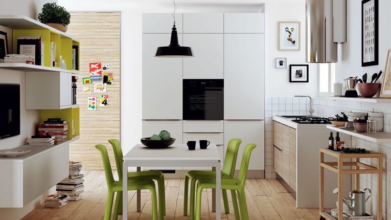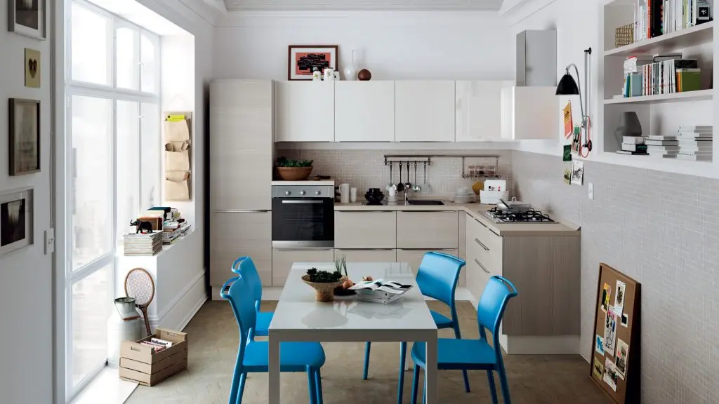 Poti lua in considerare mobilier incorporat in perete si etajere suspendate pentru a crea impresia de mai mult spatiu si pentru a-ti permite sa personalizezi cu mici decoratiuni, cesti de cafea sau carti de bucate si ghivece mici cu ierburi aromatice.