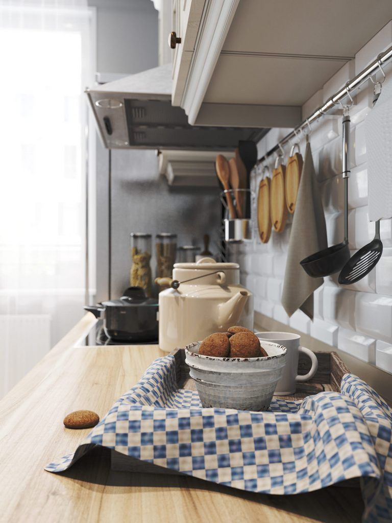 Mobilierul propus vine cu un design simplu, functional. Electrocasnicele sunt incorporate in interiorul mobilierului, cu exceptia frigiderului. Spatiul dintre corpuri a fost placat cu faianta tip Metro, un model popular si la noi. Este o varianta versatila de care nu te vei plictisi prea curand.
