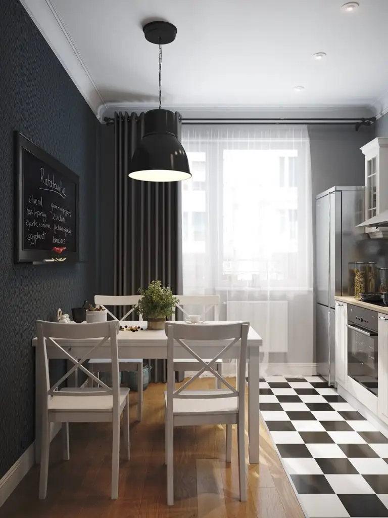Masa si scaunele sunt albe, cu un model IKEA usor de reperat. In functie de suprafata disponibila, ai putea opta si pentru o masa rotunda sau patrata, dar ar fi bine sa fie extensibila pentru momentele in care aveti mai multi oaspeti. Tapetul ales in aceasta amenajare confera profunzime spatiului, insa tu ai putea opta pentru un imprimeu mai vesel, eventual cu tematica de bucatarie.