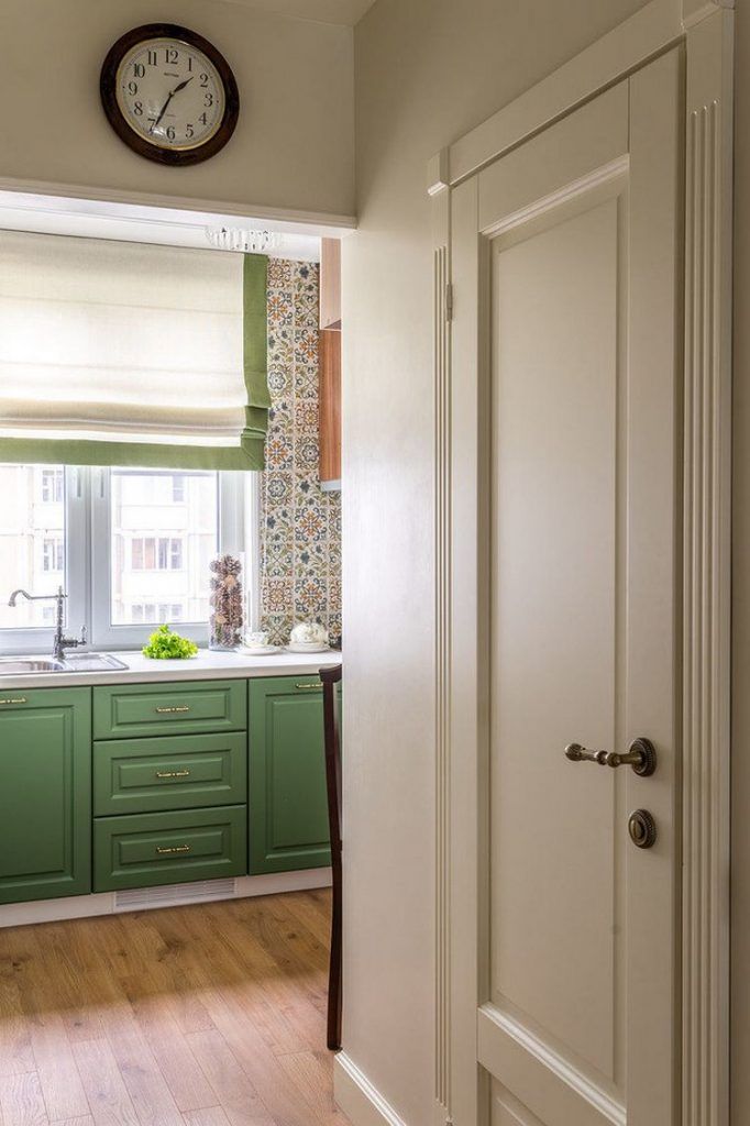 Corpurile principale de mobila au fronturi verzi, cu usi frezate, iar cele superioare sunt intr-o nuanta placuta de crem pentru a pastra amenajarea cat mai luminoasa si aerisita posibil. Pentru ca verdele sa nu fie o nuanta izolata, motivul cromatic a fost reluat si la nivelul draperiei in stil roman care imbraca frumos fereastra. Peretii expusi stropirii au fost placati cu placi ceramice decorative, pentru a se intretine mai usor. Imprimeul placilor anima atmosfera.