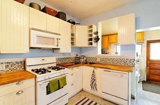 Deschide Galeria Vechile culori ale bucatariei (bleu si crem) au fost inlocuite cu alb, integrandu-se astfel in tematica intregii case. Prin simpla varuire si vopsire a peretilor si dulapurilor, intregul aspect este schimbat, parand mai luminos si mai spatios.