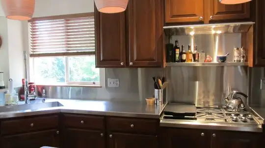 Pentru a realiza un aspect modern, proaspat, a fost inlocuit vechiul blat cu un unul lucios, din otel si o noua chiuveta functionala, integrata in acest ansamblu. Insula si barul au noi blaturi din granit, perfecte pentru noul stil adoptat. Vechiul aragaz a fost schimbat si el cu o varianta moderna de plita pe baza de gaz.